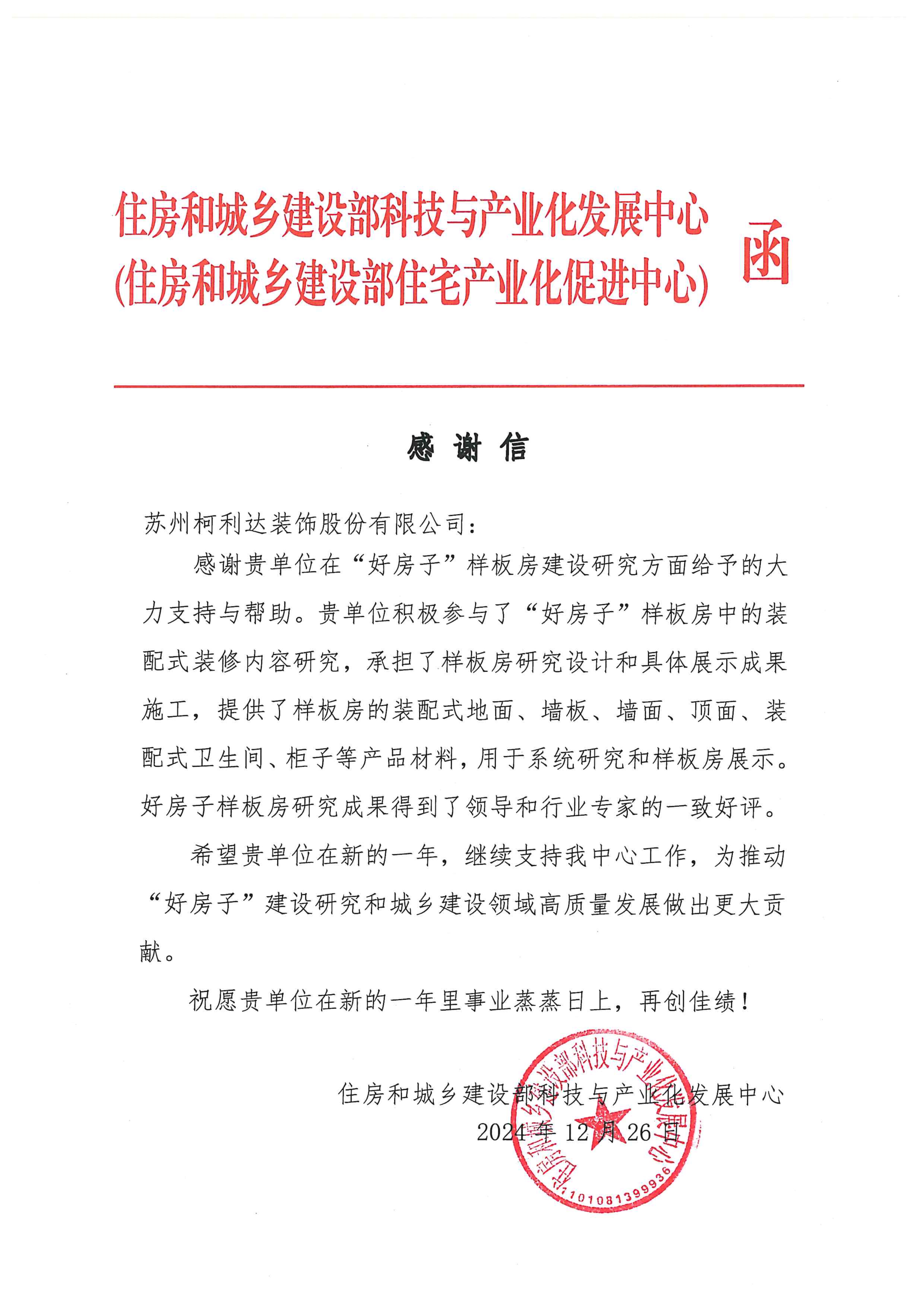 新歲漸近,祥光煥彩。在辭舊迎新之際,柯利達收到來自住房和城鄉(xiāng)建設(shè)部科技與產(chǎn)業(yè)化發(fā)展中心發(fā)來的感謝信,對公司在“好房子”樣板房建設(shè)研究方面給予的大力支持與
